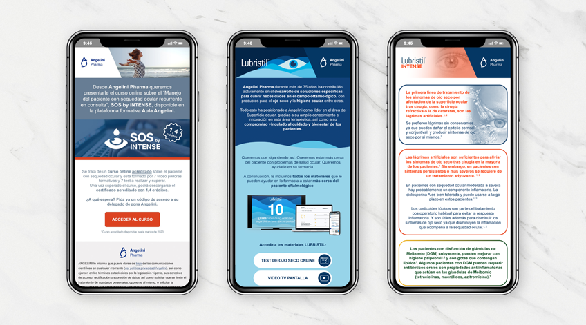 La división de Oftalmología de Angelini ha realizado diversas campañas de promoción de sus productos, orientadas a las farmacias y al consumidor final. Son campañas con información relevante sobre el producto y con un diseño atractivo a la vez que divulgativo sobre diferentes afecciones oftalmológicas.